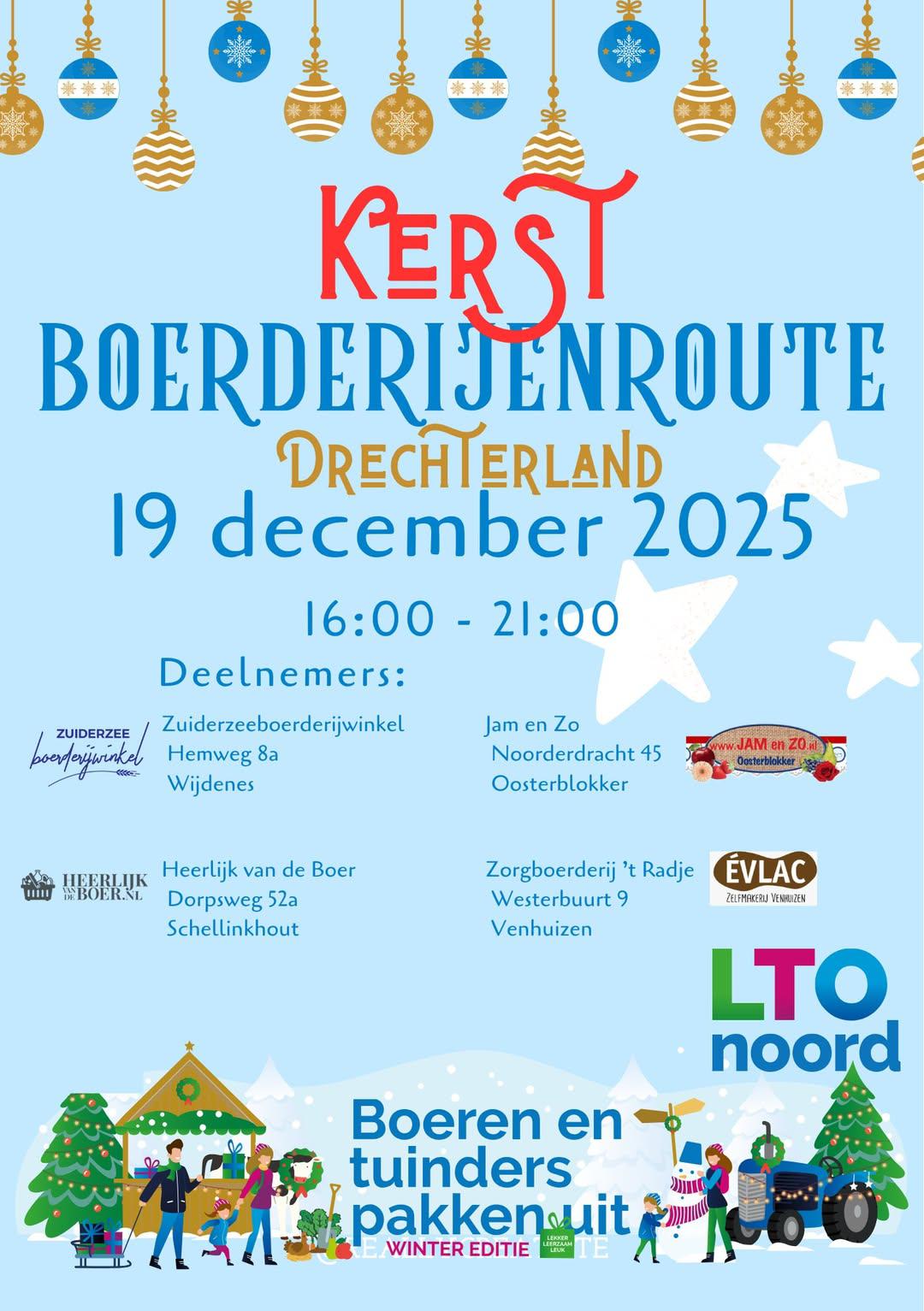 Op Vrijdag 19 december kan de route Drechterland worden gereden. Iedereen kan de route starten waar hij of zij wil. De routes, inclusief de kraampjes, zijn open van 16.00 uur tot 21.00 uur. Onderweg kun je van alles kopen bij de stalletjes bij de agrarische bedrijven.