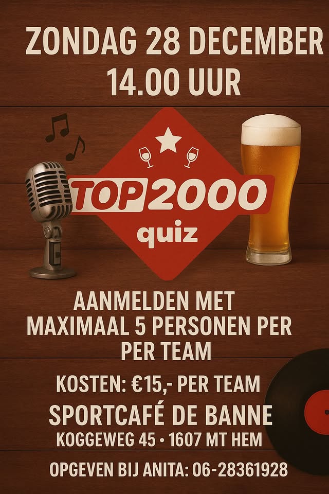 Er kunnen maximaal 14 teams mee doen. 1 Team bestaat maximaal uit 5 personen. Kosten per team € 15,00.